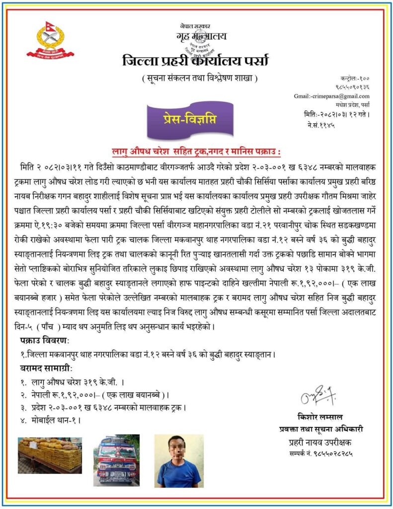 मिति:-२०८२।०३।११ गते दिउँसो काठमाण्डौबाट वीरगञ्जतर्फ आउदै गरेको प्रदेश २-०३-००१ ख ६३४८ नम्बरको मालवाहक ट्रकमा लागु औषध चरेश लोड गरी ल्याएको छ भनी यस कार्यालय मातहत प्रहरी चौकी सिर्सिया पर्साका कार्यालय प्रमुख प्रहरी बरिष्ठ नायब निरीक्षक गगन बहादुर शाहीलाई विशेष सूचना प्राप्त भई यस कार्यालयका कार्यालय प्रमुख प्रहरी उपरीक्षक गौतम मिश्रमा जाहेर पश्चात जिल्ला प्रहरी कार्यालय पर्सा र प्रहरी चौकी सिर्सियाबाट खटिएको संयुक्त प्रहरी टोलीले सो नम्बरको ट्रकलाई खोजतलास गर्ने क्रममा ऐ.१९:३० बजेको समयमा क्रममा जिल्ला पर्सा वीरगञ्ज महानगरपालिका वडा नं.२१ परवानीपुर चोक स्थित सडकखण्डमा रोकी राखेको अवस्थामा फेला पारी ट्रक चालक जिल्ला मकवानपुर थाह नगरपालिका वडा नं.१२ बस्ने वर्ष ३६ को बुद्धी बहादुर स्याङ्तानलाई नियन्त्रणमा लिइ ट्रक तथा चालकको कानूनी रित पुर्याइ खानतलासी गर्दा उक्त ट्रकको पछाडि सामान बोक्ने भागमा सेतो प्लाष्टिकको बोराभित्र सुनियोजित तरिकाले लुकाइ छिपाइ राखिएको अवस्थामा लागु औषध चरेश १३ पोकामा ३१९ के.जी. फेला परेको र चालक बुद्धी बहादुर स्याङ्तानले लगाएको हाफ पाइन्टको दाहिने खल्तीमा नेपाली रू.१,९२,००० ( एक लाख बयानब्बे हजार ) समेत फेला परेकोले उल्लेखित नम्बरको मालबाहक ट्रक र बरामद लागु औषध चरेश सहित निज बुद्धी बहादुर स्याङ्तानलाई नियन्त्रणमा लिइ यस कार्यालयमा ल्याइ निज विरुद्द लागु औषध सम्बन्धी कसूरमा सम्मानित पर्सा जिल्ला अदालतबाट दिन-५ पाँच म्याद थप अनुमति लिइ थप अनुसन्धान कार्य भइरहेको।